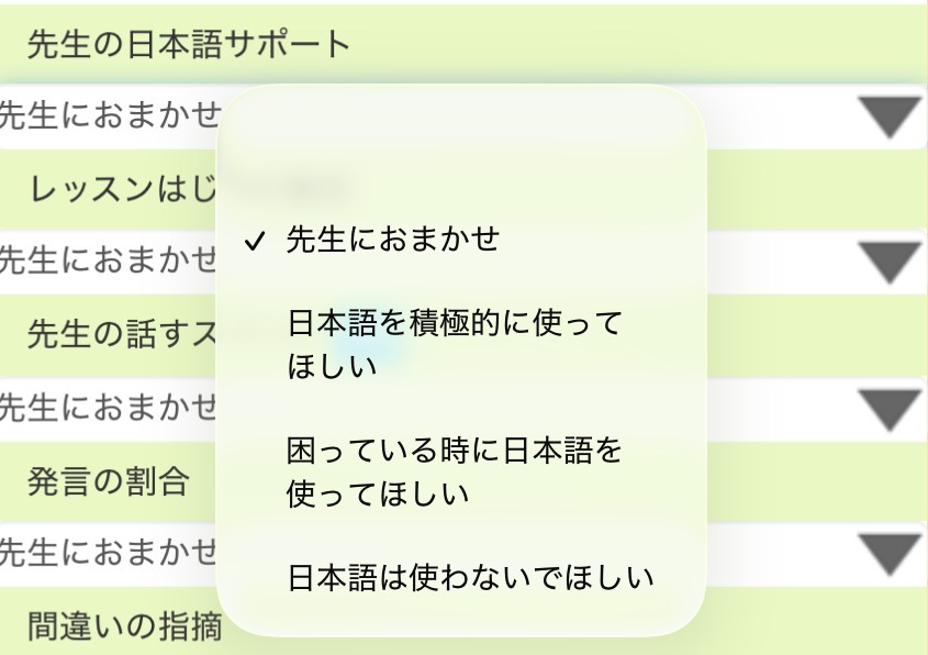 レッスン前に日本語のサポートをするかどうかを選べます。